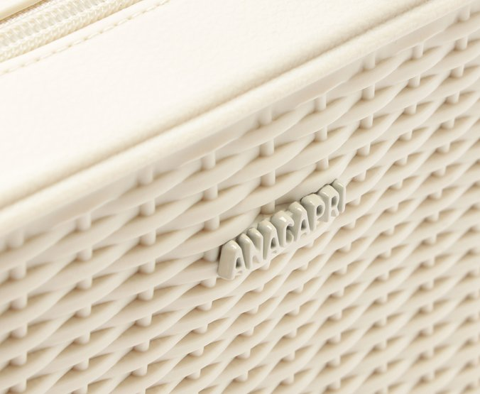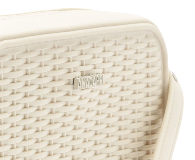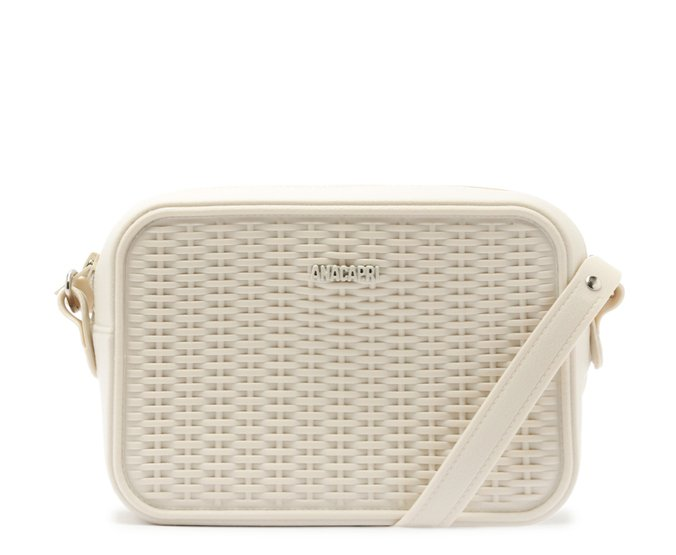 Bolsa tiracolo média em tressê e injetada, na cor branca. O modelo de tamanho médio possui alça longa transversal regulável - com fecho superior em zíper com puxador metálico com assinatura Anacapri. De shape retangular e estruturada em pvc injetado, a bolsa apresenta capa frontal em tressê e aplicação de pin metálico com assinatura Anacapri centralizado na parte superior da capa frontal.