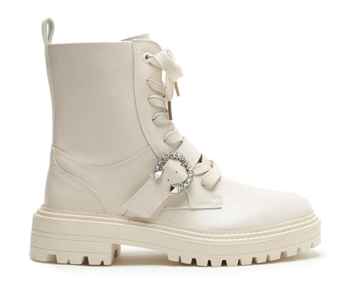 O coturno Anacapri Off-white tem cano médio, solado emborrachado tratorado robusto e bico redondo. Feito em material similar ao couro, com atacadores da cor do modelo e detalhe de tira com fivela em pedrarias.