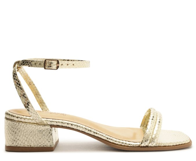 Sandália Anacapri de salto bloco dourada com tira snake. O modelo de biqueira quadrada traz cabedal e salto em bloco baixo forrado com estampa animal print de cobra. Com tira dupla sobre os dedos, traz tiras laterais que contornam o calcanhar e se conectam à tira no tornozelo, com fechamento superior em fivela lateral. Apresenta palmilha preta, com assinatura Anacapri.