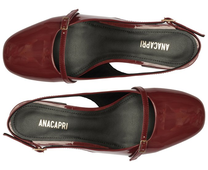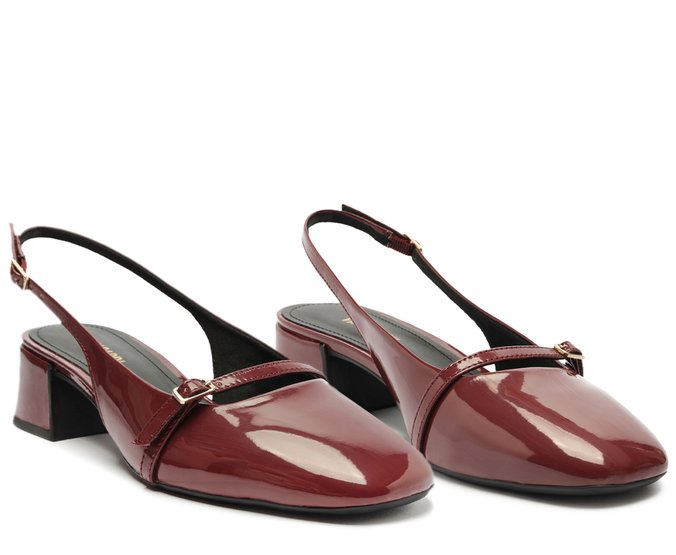 Sapatilha New Milena boneca na cor vermelho marsala. De salto em bloco baixo e biqueira quadrada, traz cabedal com recorte reto sobre o peito do pé, formato ajustado nas laterais e acabamento envernizado. Aberta atrás estilo slingback, possui tiras finas conectadas ao cabedal que seguem pelas laterais contornando o calcanhar, com fechamento afivelado lateral. O modelo traz detalhe em tirinha fina presa na lateral com fecho em fivela metálica ajustável. Com nova palmilha preta e assinatura Anacapri. A sapatilha boneca New Milena estilo slingback já é um clássico e vai se tornar o item desejo para a sua coleção. Perfeita para compor produções elegantes e sofisticadas para o trabalho e eventos. Versátil, vem para a temporada de inverno Anacapri com acabamento metalizado e biqueira envernizada. Atemporal, esse sapato em salto bloco é confortável e estruturado, garantindo estabilidade no calce.