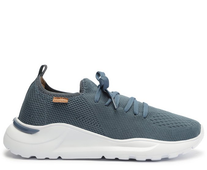 Tênis em knit Anacapri. O modelo apresenta recorte e contorno em fita no cano, com cabedal todo em tecido azul, com detalhe em perfuros na biqueira e parte traseira do tênis. De amarração, ele se ajusta como uma meia no pé e traz entressola robusta que garante maior estabilidade no calce.
